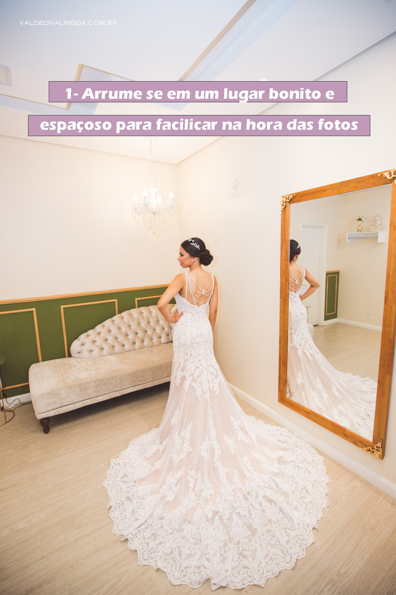Quando for escolher o lugar onde você vai se arrumar verifique se tem uma sala exclusiva para a noiva, dessa forma você fica mais a vontade com sua mãe, sogra, daminhas e madrinhas e além disso isso facilita também na hora de fazer as fotos e vídeos porque geralmente esse espaço é amplo e bonito.